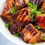 Add the canola oil (1 tablespoon) to the skillet and swirl to coat. Use tongs to remove the salmon cubes from the bowl of marinade and add them to the skillet (skin side down, if it has skin) and sear for 2-3 minutes, or until nice and brown. You should have some marinade left in the bowl. Flip the salmon using tongs and sear on the other side for 2-3 minutes, or until browned on the other side and fully cooked (see notes).